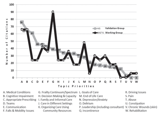 The finalized list of 18 priority topics is seen in Table 1. Five possible topics were not retained by the WG as being priorities after review of VG topics. The Pearson correlation between the results of the VG and the first iteration of Priority Topics frequencies done by the WG is 0.6793. Even though there are four topics with quite marked differences (Frailty, End-of life care, Depression, and Anxiety), the overall correlation was very good (see Figure 1). There is an even higher correlation (0.8597) for the generic skills of competence generated by VG and WG.