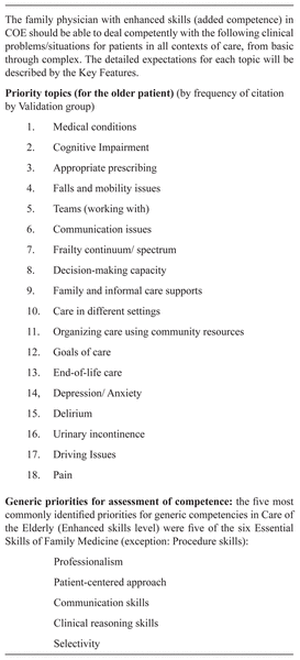 Given the importance of having family physicians with skills in COE, it is desirable to increase the number of physicians at the Enhanced Skills level of expertise. The CFPC hoped to develop a clear framework for assessing the competence of residents training in COE and of practicing physicians (in a practice-eligible route of certification) to improve access and to standardize a shared competence to expert care of frail and healthy seniors. This paper describes the development of Priority Topics, which is the first step of the process to establish competence in COE at the Enhanced Skills level.