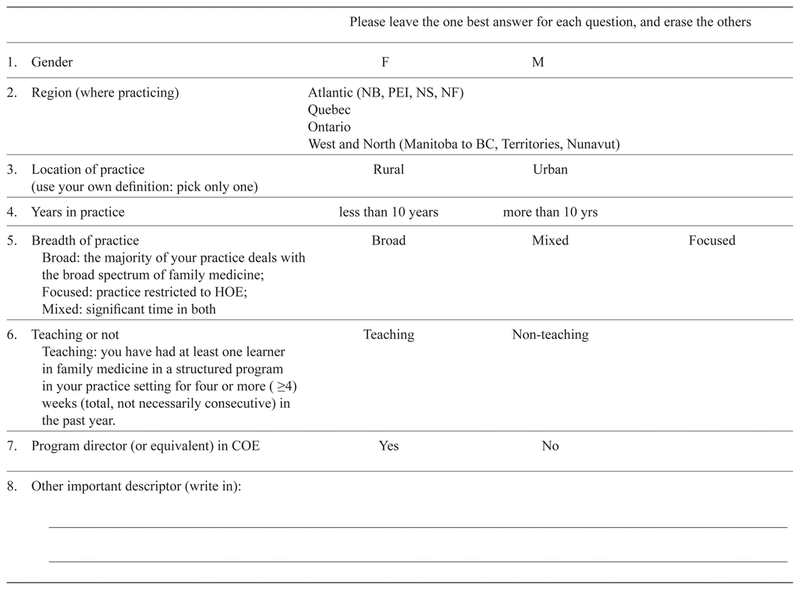 The questions are being asked with reference to a practitioner who is a family physician with enhanced skills in the domain of Care of the Elderly (COE), at the start of their independent practice in this domain of interest. You must set aside your own practice profile, “put on the hat” of a family physician practitioner with enhanced skills in the domain of COE, and answer the questions from this point of view.