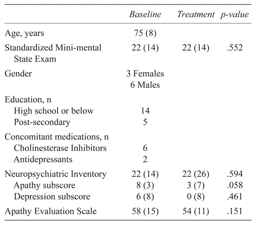 Nine AD patients being treated with MTP for apathy agreed to participate. The median length of treatment exposure at time of follow-up was 4.0 weeks (range: 3–17 weeks) and the average dose was approximately 15 mg/day. No patients experienced adverse events. Overall, there were trending decreases in apathy test scores (AES and NPI apathy) following treatment (Table 1). Five of nine patients remitted based on NPI apathy scores.