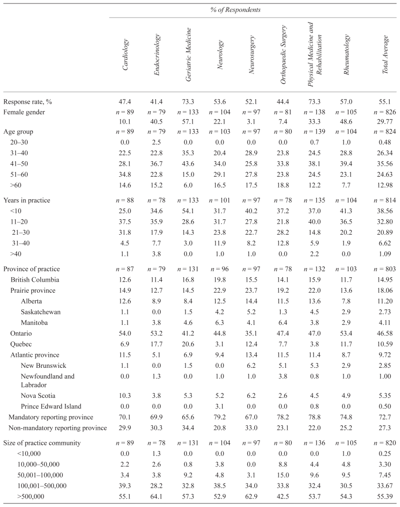Table 1 shows the characteristics of the respondents by medical specialty. There are some notable and anticipated gender differences across specialties (e.g., 57% of geriatricians and 3% of neurosurgeons were female). With the exception of Quebec, the response rate by province reflected provincial populations.