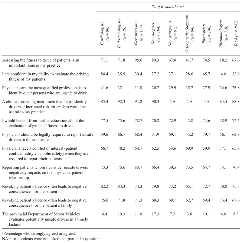 Attitudes of respondents toward assessing fitness to drive by specialty