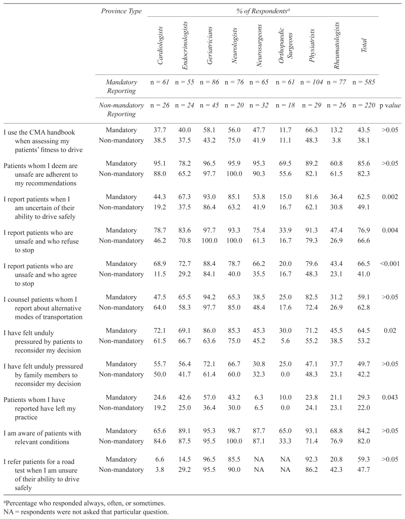 The respondents’ practice patterns correlated well with their perceived importance of the issue to their practices (Table 3). Most respondents (86% mandatory and 82% non-mandatory) indicated that they believed their patients adhered to their driving recommendations; no differences were identified between specialists in mandatory reporting provinces versus those in non-mandatory reporting provinces. Significantly more physicians in mandatory reporting provinces than in non-mandatory reporting provinces report patients whom they consider unsafe to drive (67% vs. 41%) or whose ability to drive safely is questionable (63% vs. 49%) ( p < .05). Geriatricians (93% mandatory and 86% non-mandatory) and neurologists (85% mandatory and 63% non-mandatory) had the highest rates of reporting patients in the latter category, while cardiologists (44% mandatory, 19% non-mandatory) had low rates of such reporting. More physicians from mandatory reporting provinces reported feeling unduly pressured by patients to reconsider the decision (65% mandatory vs. 53% non-mandatory; p = .02). Similar percentages were found regarding undue pressure by family members, but no significant differences were identified between province type. Overall, 6% to 57% of respondents reported that patients had left their practice over driving issues; this was reported by significantly more respondents from mandatory provinces (29%) than non-mandatory provinces (22%) ( p = .043).