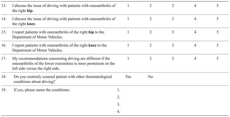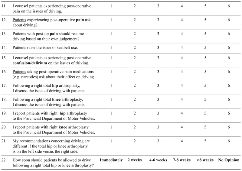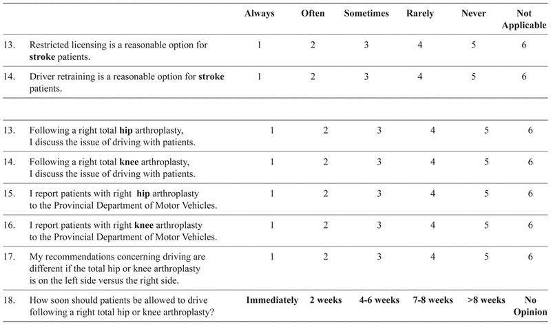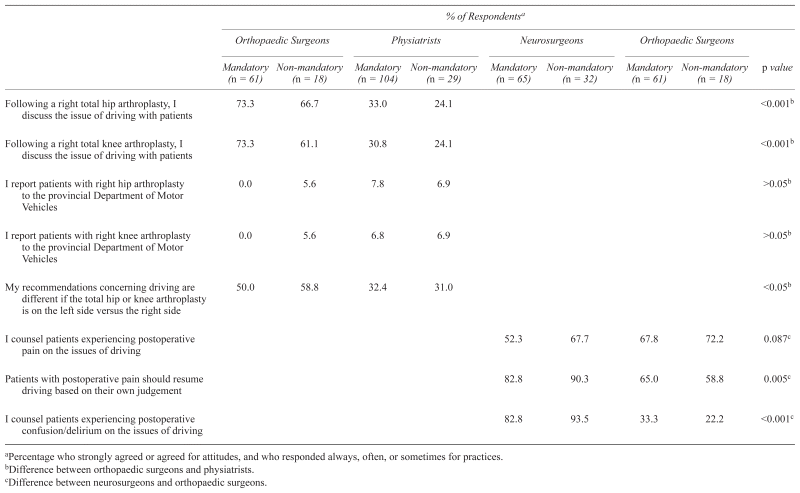 Most orthopaedic surgeons (> 61%) indicated that they discussed driving issues with patients after a right lower leg arthroplasty (Table 5). The rate for physiatrists was significantly lower (31%; p < .05). None of the orthopaedic surgeons from mandatory reporting provinces and 5.6% of those from non-mandatory reporting provinces indicated that they report these patients to the authorities.
