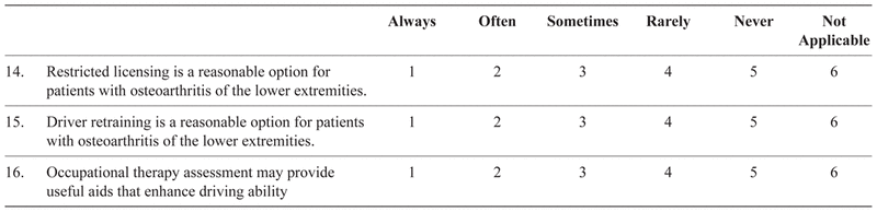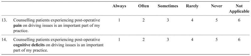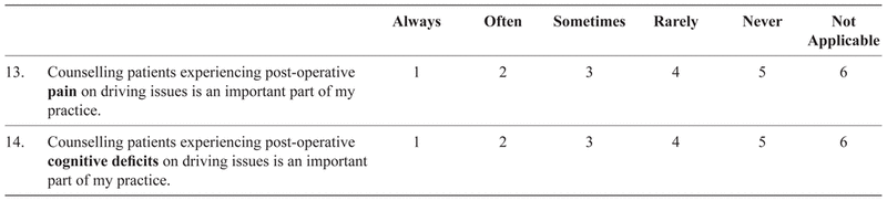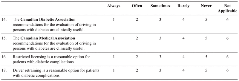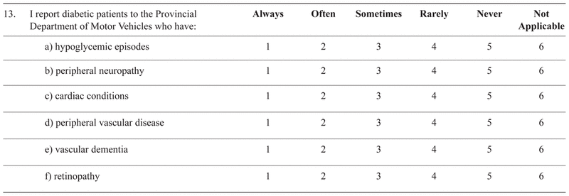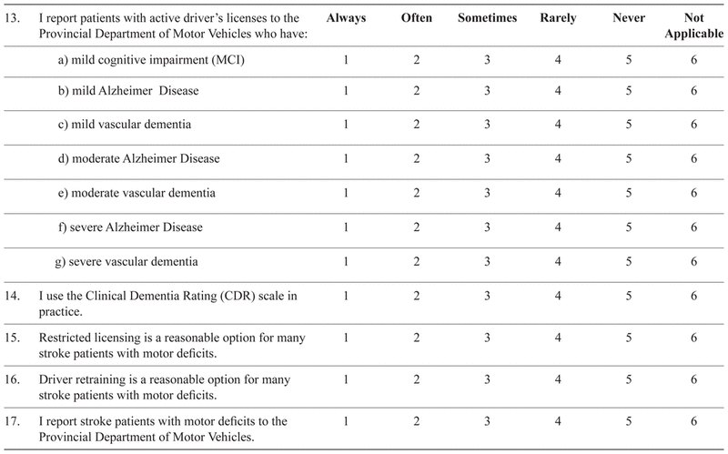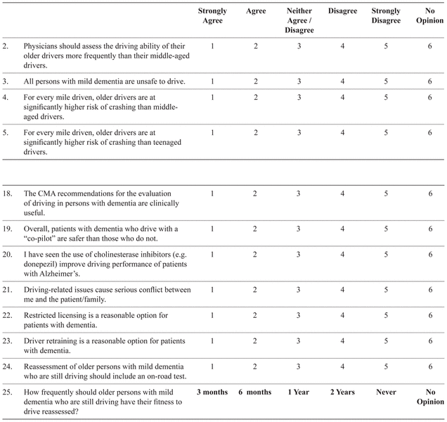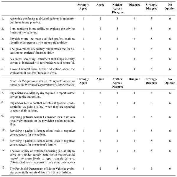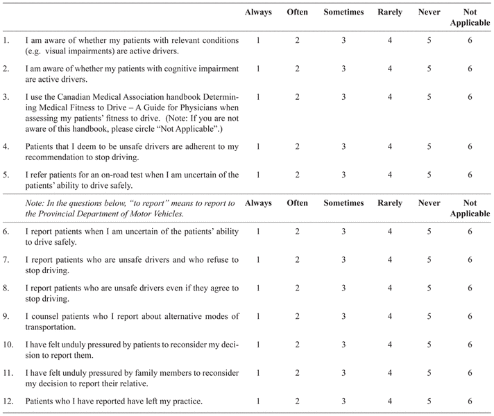 The survey commenced by asking whether the physician was in active clinical practice. Those answering “no” were asked to return a blank survey and the identifying coded postcard. The survey contained five main sections: attitudes towards driving assessments and reporting; practices and activities pertaining to driving assessments; knowledge of jurisdictional driving policies and programs; the demographic and practice characteristics of respondents; and a comments section. A five-point Likert response scale was used for most questions (e.g., from “strongly agree” to “strongly disagree”, and “always” to “never”).