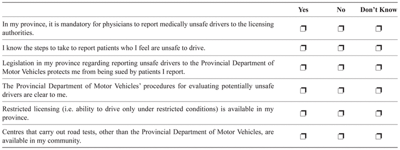 A high percentage of specialists (87%) from provinces with mandatory reporting requirements were aware of this responsibility. In contrast, 9–30% of respondents in provinces with discretionary requirements incorrectly stated that the reporting of unsafe drivers was mandatory in their jurisdiction. Similar results were found in a survey of American geriatricians;(27) a much higher percentage of those practising in California (where reporting of patients with moderate to severe Alzheimer disease is mandatory) were aware of the reporting requirements, compared with those practising in states with discretionary reporting. It remains controversial whether the legal requirement of mandatory reporting of unsafe drivers helps or hinders their safety.(28) Mandatory reporting has the potential to facilitate the removal of unsafe drivers from the road, but also creates a disincentive for physicians to pursue driving assessments,(17) possibly owing to factors such as not having flexibility to interpret driving assessment results and wishing to act in the fairest manner for their patient.