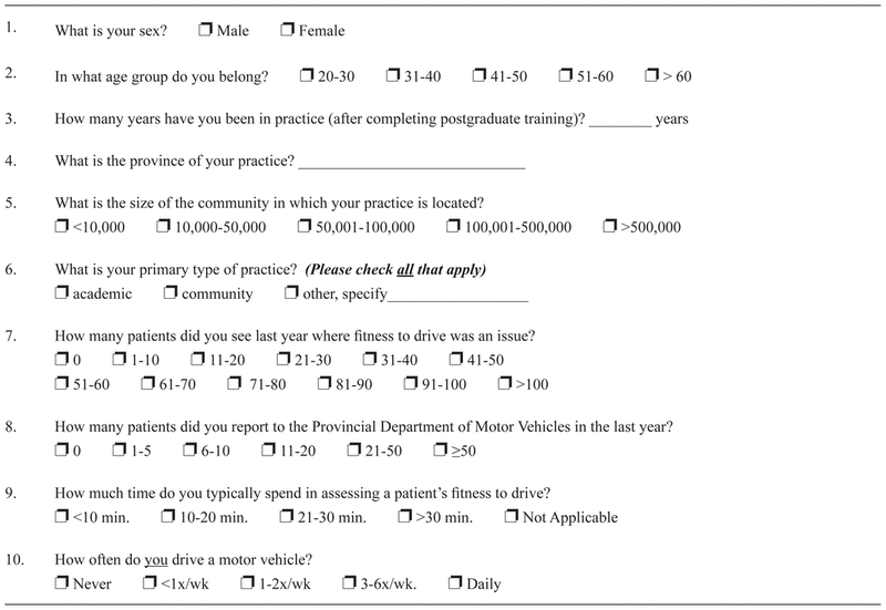 Many specialists encounter issues related to fitness to drive in their practices. We sought to determine the attitudes and practices of Canadian specialists regarding the assessment of medical fitness to drive in older persons.
