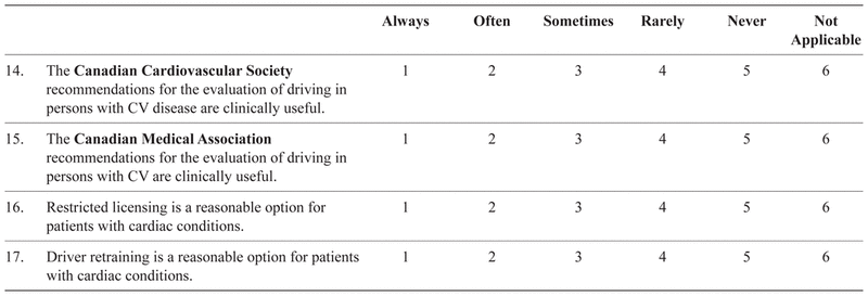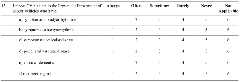 The response rates in our study were variable for the different specialty groups; however, they were greater than 50% for all groups analyzed. As would be expected, the response rates were higher for the specialties that deemed assessment of medical fitness to drive of higher importance to their practices; however, the overall response rate was equal to or better than that in similar surveys.(17,20) The fact that the survey was conducted in English and the predominant language in Quebec is French likely accounts for the lower response rate from that province. Since the study design assured anonymity, we could not determine whether responders were different in any important way from non-responders. However, in a similar survey,(17) the demographic characteristics of the total sample surveyed was similar to those of responders. We were unable to perform chart reviews of responders’ actual practices; therefore, there may have been differences between how physicians responded to the survey and their actual practices. Finally, since physicians whose primary language is French were not surveyed, the results cannot be generalized to them.