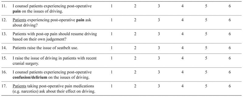 Most neurosurgeons (83–90%) felt that patients with postoperative pain should resume driving based on their own judgement (Table 5), whereas 59–65% of orthopaedic surgeons held this view. The majority of neurosurgeons (83–94%) indicated that they counsel patients experiencing postoperative confusion or delirium on driving, compared to 22–33% of orthopaedic surgeons ( p < .05). There were no significant differences between specialists from mandatory and non-mandatory reporting provinces.
