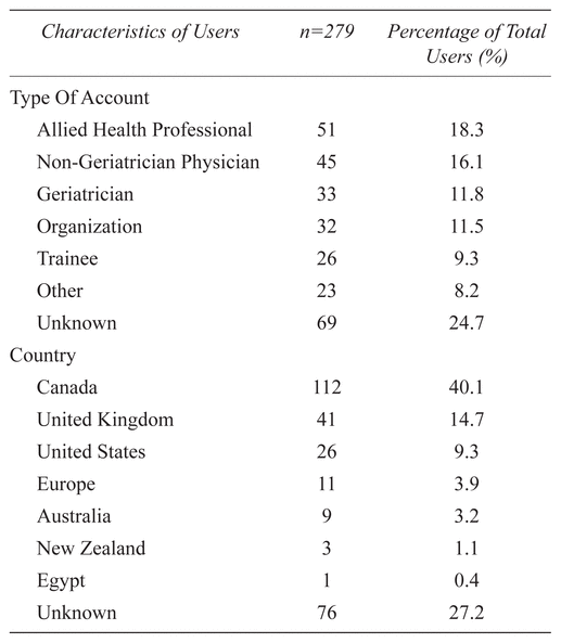 The two categories of users with the greatest representation were allied health professionals (18.3%) and non-geriatrician physicians (16.1%). Users came from seven different countries, with the majority from Canada (40.1%) (Table 1).