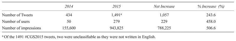 In comparing the 2014 (#CGS2014) and 2015 (#CGS2015) Twitter data, there were 434 tweets with the hashtag #CGS2014 created by 50 contributors, with 155,600 impressions (Table 2). From #CGS2014 to #CGS2015, there was a 243.6% increase in the number of Tweets, 458.0% increase in the number of users, and 506.6% increase in the number of impressions.