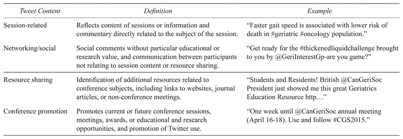 The hashtag #CGS2015 was registered with the SymplurTM Healthcare Hashtag Project (Symplur LLC, Upland, CA), enabling tweets associated with the hashtag to be extracted and analyzed (www.symplur.com) prospectively. The analysis period included the week prior to the start of the conference, the three days of the conference, and the three days after the conference. A transcript of all tweets that included “#CGS2015” was downloaded using the SymplurTM Twitter analytic tool. An additional third-party Twitter analytic tool, TweetReach (www.tweetreach.com), was used to retrospectively analyze tweets with the hashtag “#CGS2014” for historical comparison to the 2014 CGS annual meeting. The total number of tweets, comprising original tweets and retweets or modified tweets, was obtained. Tweet impact was expressed as “impressions,” which is a numerical value representing the potential views a tweet may receive—a standard directional metric in Twitter. The impressions metric was calculated by SymplurTM by multiplying the number of Tweets per participant with the number of followers that the participant currently has. Growth was determined by comparing the total number of #CGS2015 tweets, participants, and impressions to #CGS2014. Demographics of Twitter users, including occupation and country of origin, were retrieved via self-reported information from the public Twitter profiles. The tweets were sorted into four categories: 1) Session-related: reflects content of sessions or information and commentary directly related to the subject of the session; 2) Networking and Social: social comments without particular educational or research value, and communication between participants not relating to session content or resource sharing; 3) Resource Sharing: identification of additional resources related to conference subjects, including links to websites, journal articles, or non-conference meetings; 4) Conference Promotion: promotion of current or future conference sessions, meetings, awards, or educational and research opportunities, and promotion of Twitter use. Two study authors conducted the content analysis independently, and disagreements were resolved by a third study author. Descriptive statistics were expressed in proportions for categorical variables. Inter-rater reliability of categorization was expressed as a kappa statistic.