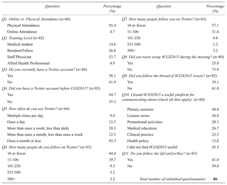 All attendees of the CGS 2015 annual meeting received a paper questionnaire as part of the conference package. The questionnaire consisted of 11 questions, with categorical options for respondent demographics, Twitter usage in general, and user experience of the #CGS2015 hashtag. The questionnaire also had three open-ended questions to explore the impact of Twitter on the conference experience, drawbacks of Twitter, and general comments. A copy of the questionnaire was also made available online and promoted with the @CanGeriSoc Twitter handle. The online version of the questionnaire enabled the authors to include data from people who did not attend the conference live, but were participating in the online discussion via Twitter. Questionnaire analysis was an iterative process between two study personnel using an inductive approach to identify themes.