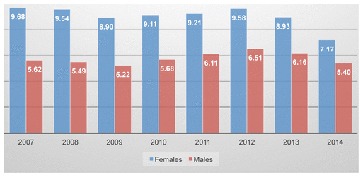 FIGURE 1 Antibiotic use for urinary tract infections by gender, 2007 to 2014. Usage is in DDD per 1000 residents per day. |