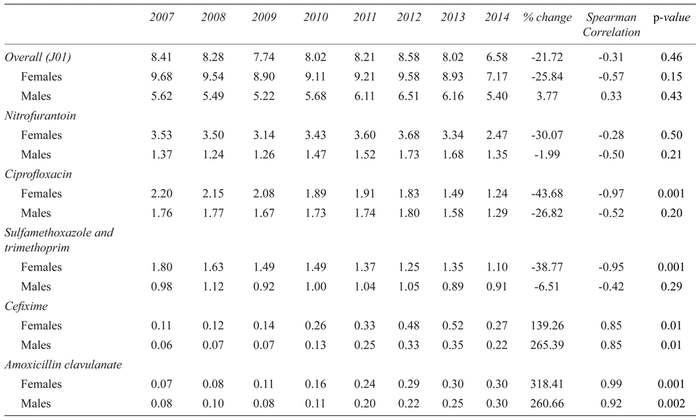 TABLE 1 Common antibiotics used for urinary tract infections by gender, 2007 to 2014