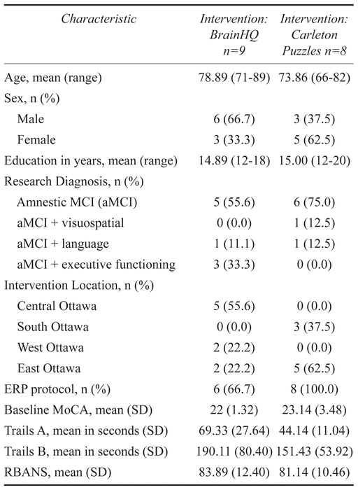 Of the 17 participants who took part in the trial, only one participant dropped out during the intervention period. The average attendance was 24/27 sessions. There were no significant differences in intervention attendance between the BrainHQ and Carleton puzzle groups. Reasons for missed sessions included family visiting, vacations, and illnesses (both research assistant and participant). No participant felt that the neuropsychological test battery or EEG testing was too long, and no one dropped out of the ERP arm of the study.