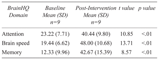 Task performance improved for both the BrainHQ and Carleton puzzles.(20,21)Table 2 demonstrates that for the BrainHQ arm, the scores on the three domains utilized in this study (attention, brain speed, and memory) were significantly improved (p < .01).