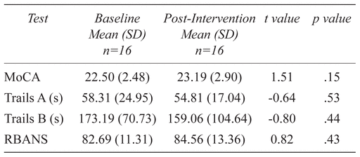 Cognitive tests were performed at baseline and post-intervention. These included the Repeatable Battery for the Assessment of Neuropsychological Status (RBANS),(12) Trail Making Test A & B,(13,14) and the Montreal Cognitive Assessment (MoCA).(15)