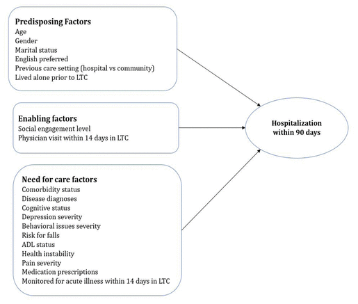 The Behavioral Model of Health Care Utilization provides a useful framework for examining the individual and contextual variables that predict hospitalization in LTC.(35) The model explores the relationship between predisposing, enabling, and need for care factors related to health-care utilization.(35) It has been applied extensively to structure and interpret the results of studies evaluating health-care use across different population groups,(36) and more specifically, acute-care use in older adults.(37) Adapting this model into a conceptual framework for our study objective (Figure 1), we hypothesized that hospitalization is dependent on a resident’s propensity for care utilization or their predisposing factors (e.g., age, gender, whether they are living alone), their ability to access care, or enabling factors (e.g., availability of services in LTC), and their need-for-care factors (e.g., perceived acuity of illness by resident or health professional).(35)