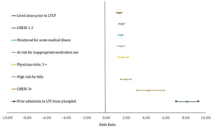 Entry to LTC from a hospital was the strongest predictor of future hospitalization (OR: 8.1, 95% CI: 7.1–9.3), followed by a score of three or greater on the Changes in Health, End-stage Signs and Symptoms scale, a measure of moderate to severe medical instability (O.R 4.2, 95% CI: 3.1–5.9). Other variables that increased the likelihood of hospitalization included being flagged as a high risk for falls, two or more physician visits, and increased monitoring for acute medical illness within 14 days of admission.
