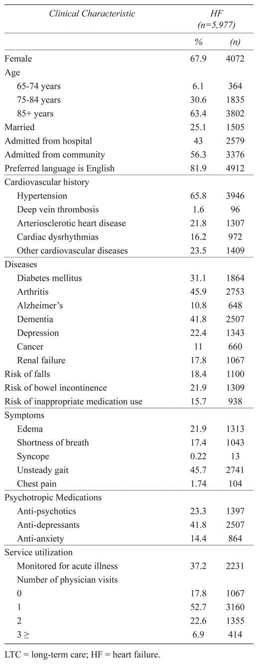 There were 48,601 residents admitted to LTC in Ontario between 2011 and 2013; of these, 12.3% (n=5,977) were diagnosed with HF. Table 1 and Table 2 show the baseline characteristics and clinical scores of residents at admission to LTC. Residents with HF were predominantly female, widowed and/or single, 85 years and older, and more frequently admitted from the community vs. the hospital (56.3% vs. 43%). They also had a high number of comorbidities (6.5 ± 2.4) and polypharmacy (11.9 ± 4.6 medications), commonly defined by a cut-off of 5 or more daily prescription medications.(61) One in four were diagnosed with dementia at admission, while one in five were diagnosed with depression. While residents experienced moderate to high levels of social engagement at admission to LTC, 20% were found to be socially withdrawn. Use of antipsychotics and antidepressant medications was found to be common in the population (23.3% and 41.8%, respectively). They also showed significant functional limitations, with 69.9% of the residents receiving scores of 3 and above on the ADL Hierarchy Scale. Though 50.9% of the residents showed low levels of health instability (as indicated by a CHESS score of 3 or less), 6.6% experienced moderate to high levels of instability. Seventy-four per cent were at risk of developing pressure ulcer sores at admission and reported living with moderate to high levels of pain (47%). Over a third of residents were monitored for acute illness (37.2%), and a majority had at least one physician visit (82.2%) within the first 14 days of admission.