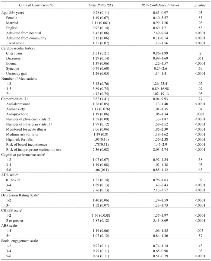 The rate of hospitalization within 90 days of admission to LTC among residents with HF was 36.2%. In the bivariate analysis, the strongest predisposing factor was admission into LTC from the hospital setting, increasing the likelihood of subsequent hospitalization by 8.5 times (95% CI = 7.49–9.54). Living alone prior to admission to LTC was also found to increase risk of hospitalization by 1.35 times (95% CI = 1.17–1.56). On the other hand, admission to the LTC from the community was found to be 8.33-fold protective at the bivariate level (95% CI = 7.1–9.1). Enabling factors such as high levels of social engagement were found to significantly reduce the odds of hospitalization by 1.56 times (95% CI = 1.96–1.27). Even though physician visits within 14 days of admission were initially hypothesized to be protective, residents receiving two and three or more visits were found to have higher likelihood of hospitalization, with ORs of 1.58 and 1.99, respectively. A number of need-for-care factors were found to be independently associated with subsequent hospital admission. These included being monitored for acute illness within 14 days of admission, being flagged as high risk for falls and for inappropriate medication use, medium to high levels of functional impairment, and exhibiting symptoms of depression. Within this category, high levels of health instability as measured by CHESS was found to have the strongest relationship with hospitalization (O.R.: 6.87; 95% CI = 5.43–8.69). Detailed bivariate results and respective ORs are available in Table 3.