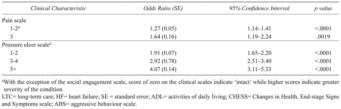 To examine the association of hospitalization with residents’ physical, mental, and social status at admission, items on the RAI 2.0 were combined into summary scales across various health domains. These variables fell under the need-for-care category and included: the Aggressive Behaviour Scale (ABS), a 12-point measure of the frequency and level of aggressive behavior;(48) the Activities of Daily Living Hierarchy Scale (ADL), a 6-point measure of the stage of functional disability;(49) the Changes in Health, End-stage, Signs and Symptoms scale (CHESS), a 5-point measure of medical instability, previously shown to be predictive of mortality;(27,50) the Depression Rating Scale (DRS), a 7-point measure indicative of possible depression symptoms;(51) the Cognitive Performance Scale (CPS), a 6-point index of impaired cognitive performance;(52) the Pressure Ulcer Risk Scale (PURS), an 8-point scale that is predictive of a resident’s risk of developing a pressure ulcer;(53) and the Pain Scale (PS), a 3-point validated instrument assessing pain levels in LTC.(54)