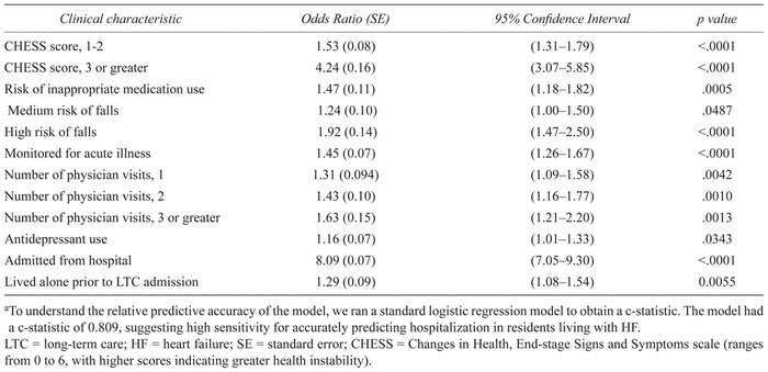 This was a retrospective cohort study of older adults diagnosed with HF, who were admitted to LTC in Ontario, Canada, between 2011 and 2013. Multivariate logistic regression models using generalized estimating equations were developed to determine predictors of hospitalization in residents with HF.