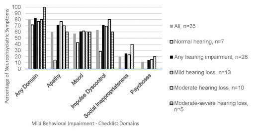 High hearing loss prevalence is expected, given the age range, but the high MBI-C findings are notable. In descending order, the prevalence of the MBI domains for the hearing impairment group was: apathy and impulse dyscontrol (tied in first place), mood, social inappropriateness, and psychoses. These distributions were tested with a model and age was not found to have an influence. A sample item from the apathy domain includes: