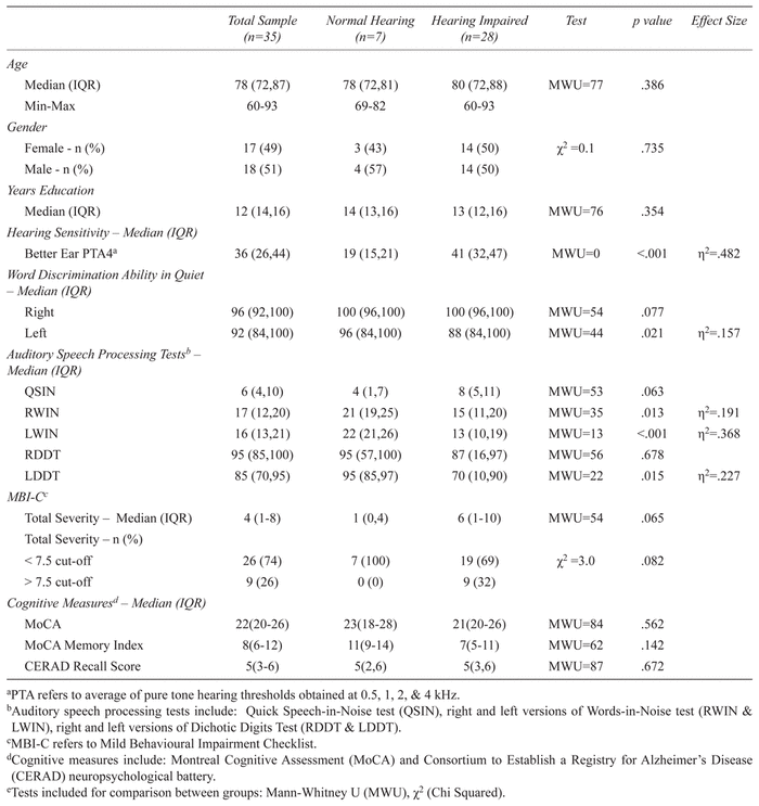 Seven participants had normal hearing (4FPTA < 25 dB HL) and 28 participants had hearing impairment. Of the 28 hearing impaired participants: 13 had mild (4FPTA ≥ 25 and < 40), 10 had moderate (4FPTA ≥ 40 and < 55), and 5 had moderately severe hearing loss (4FPTA ≥ 55 and < 70). Normal hearing vs. hearing impaired groups did not differ in terms of age, gender, years of education or any cognitive test result, but participants with hearing impairment scored lower on the WIN test for right and left ears and had lower left DDT (Table 1).