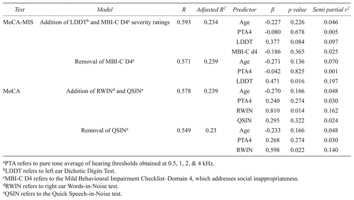 Hierarchical multiple regression models for the MoCA-MIS and MoCA are presented in Table 2. The step 1 results where age and hearing sensitivity were added were not significant for any of the models shown. For the MoCA-MIS, the LDDT emerged as the best predictor carrying the hightest Beta weight. When entered singly, the LDDT accounted uniquely for 20% of MoCA-MIS variance. For the MoCA, the RWIN was the best predictor and accounted for 16% of unique variance.