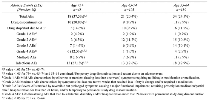 AE data are shown in Table 2. As previously noted, for the AE analysis, the 43 patients who did not have a follow-up visit were excluded, resulting in a total of 290 for this outcome. Of the 290, 48 were (16.6%) were 75+ years of age, 103 (35.5%) were 65–74, and 139 (47.9%) were 55–64. Patients 75+ experienced a statistically higher rate of AEs compared to those 65–74 (p = .0259), and a significantly higher AEs rate when compared to the two younger groups combined (p = .0427). Infections were the most commonly reported AEs for all ages, but the rate was significantly higher among those 75+ compared to the younger age groups. Genitourinary and pulmonary infections were the most commonly reported infections. AEs leading to drug discontinuation and those deemed as Grade 4 (i.e., life-threatening) were significantly more likely in the 75+ age group. While multiple AEs were more common among those 75+, this was not statistically significant (p = .0524 when the rate among those 75+ was compared to both younger groups combined). Rates of AEs did not differ significantly by sex across the three age groups (p > .5).