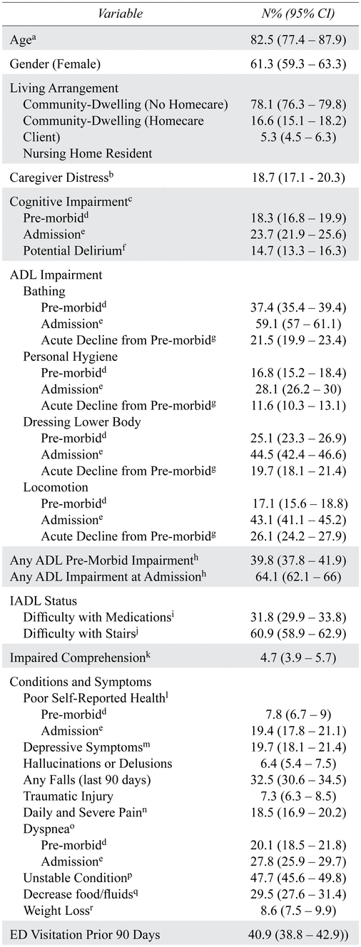 We conducted a secondary analysis of the Canadian cohort from the interRAI multinational ED study. Data were collected using interRAI ED contact assessment on patients 75 years of age and older (n = 2,274), in eight ED sites across Canada. A series of descriptive statistics were reported. Adjusted associations were determined using logistic regression.