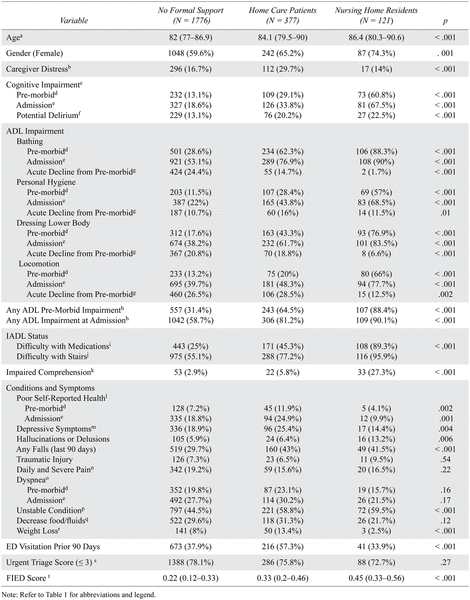 To our knowledge, this is the first study to compare both detailed patient profiles and health service utilization patterns among older ED patients requiring different levels of formal support in the community. We addressed weaknesses in the existing literature by reporting a comprehensive set of geriatric syndromes and functional assessments not commonly available in an emergency setting.