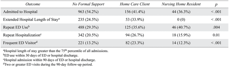 Approximately one-half (51%) of all older adults who presented to the ED for care required hospital admission, with 6.4% (n = 147) dying during the index hospital stay. There was no difference in the rate of in-hospital death between those with no formal support services (6.6%), home care clients (6.8%), or nursing home residents (6.3%; p = .13). Of the remaining 2,127 patients, 31% (n = 659) returned to the ED within 30 days of hospital discharge, and 21% (n = 454) were admitted for in-patient care within 90 days of discharge. Table 3 displays the unadjusted comparison of post-disposition outcomes across the three ED cohorts.