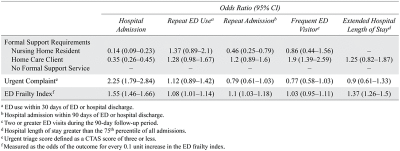 After adjusting for triage acuity and frailty, the level of formal support was not associated with the occurrence of a repeat ED visit or an extended hospital length of stay. Interestingly, not a single nursing home transfer resulted in an extended hospital length of stay (greater than 20 days). With regard to frequent ED visitation, home care clients had roughly double the odds of returning to the ED two or more times during the 90-day follow-up period (OR = 1.9; 95% CI = 1.39–2.59). Older adults transferred from a nursing home had a 54% reduction in the odds requiring hospital admission within 90 days of hospital discharge when compared to those receiving no formal support services (OR = 0.46; 95% CI = 0.45–0.79). An 0.1 unit increase in the ED frailty index score was associated with all outcomes, excluding frequent ED visitation. Triage acuity was only associated with hospital admission, with those assigned an urgent CTAS score of three or less having roughly twice the odds of being admitted for in-patient care (OR = 2.25; 95% CI = 1.79–2.84).