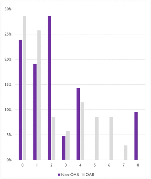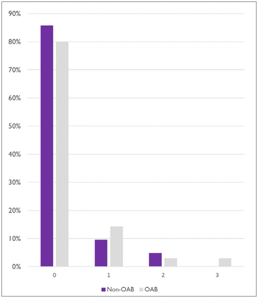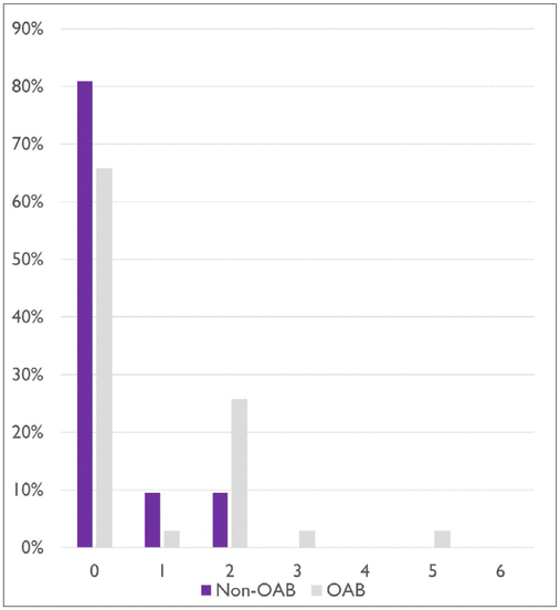 Fifty-six people were recruited, of whom 35 (62%) met the criteria for inclusion in the OAB group. The OAB group had more women than the control group (85% vs. 62%, p = .054, Fisher’s exact test). No significant differences between the groups were seen with age, CCI, number of medications take, or ACB score. These data are summarized in Table 1 and graphically in Figures 1 to 3.