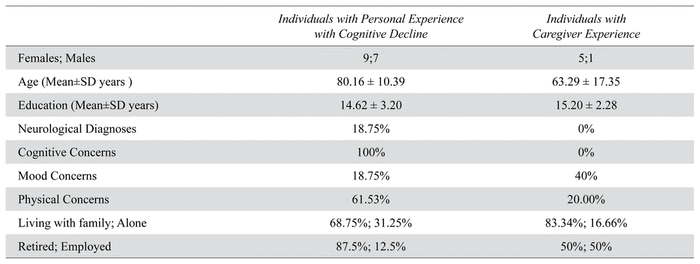TABLE 1 Participant demographics and characteristics for individuals with personal experience of aging in place with cognitive decline and individuals with caregiver experience
