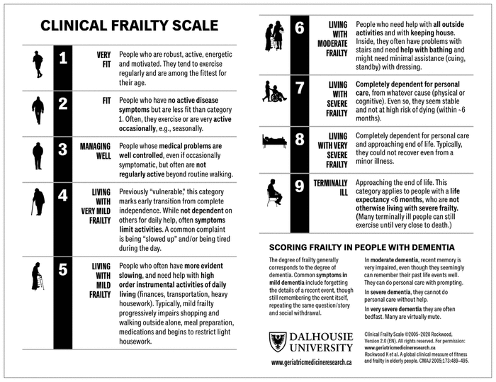 19 Rockwood K, Theou O, Fay S, et al. Top Tips to help you use the Clinical Frailty Scale. Accessed on July 28, 2020. Available from: www.dal.ca/sites/gmr/our-tools/clinical-frailty-scale/cfs-guidance.html