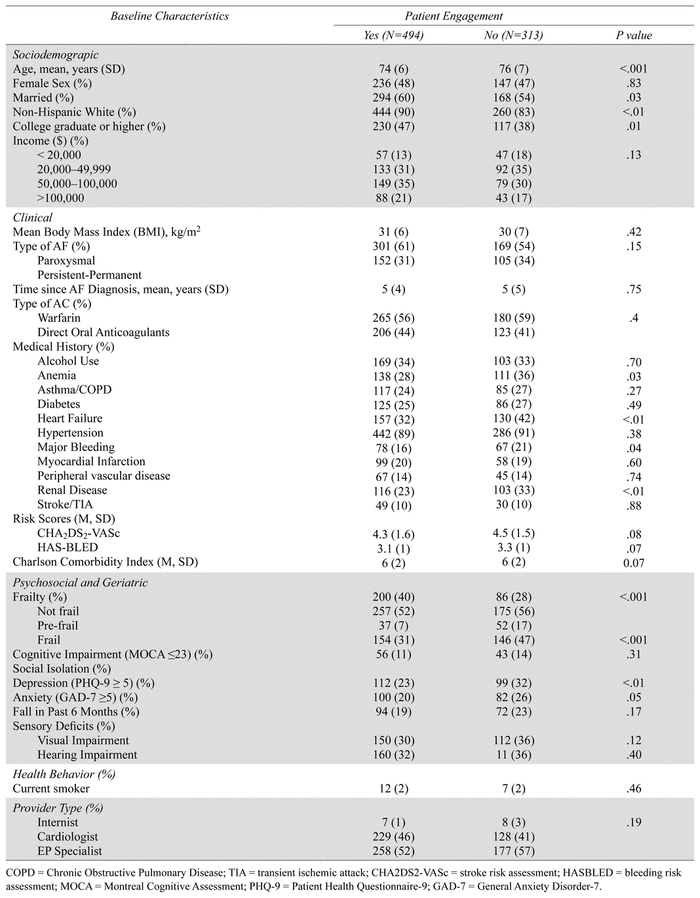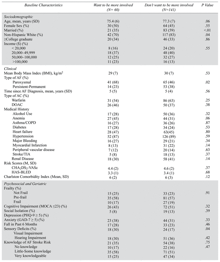 We used data from the Systematic Assessment of Geriatric Elements-Atrial Fibrillation study which includes older ( ≥65 years) patients with AF and a CHA2DS2-VASc≥2. Participants reported engagement in SDM by answering whether they actively participated in choosing to take an oral anticoagulant (OAC) for their condition. Multiple logistic regression was used to assess associations between sociodemographic, clinical, geriatric, and psychosocial factors and patient engagement in SDM.
