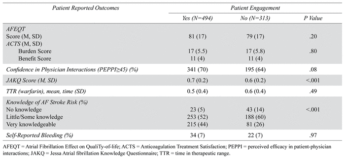 Patient decision tools have been shown to improve patient knowledge of OAC therapy and help patients make definitive choices regarding which OAC to take.(11,44) Patient-provider communications need to be fostered to improve patient engagement in their OAC treatment decision-making process. In our study, nearly all participants (97%) were still on OAC therapy at the Year 1 follow-up; this increased level of OAC adherence, coupled with a largely medically literate patient population, may help explain the high level of engagement observed.