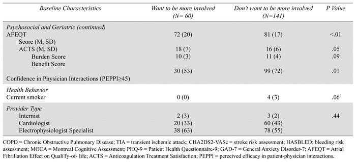 We compared participants who reported being engaged in the decision-making process for stroke prevention treatment with those who did not engage in SDM according to their baseline sociodemographic, psychosocial, and clinical characteristics, and participant reported outcomes. We also examined and compared the baseline characteristics of participants who did not engage in SDM but wanted to be more involved and those who did not want to be involved in the decision-making process. Continuous variables were summarized as means and standard deviations when normally distributed and as medians and interquartile ranges when skewed. Unpaired t -tests were used for group comparisons for continuous variables, and chi-square tests for categorical variables. Multivariable logistic regression modeling was used to examine factors associated with patient engagement in SDM for stroke prevention.