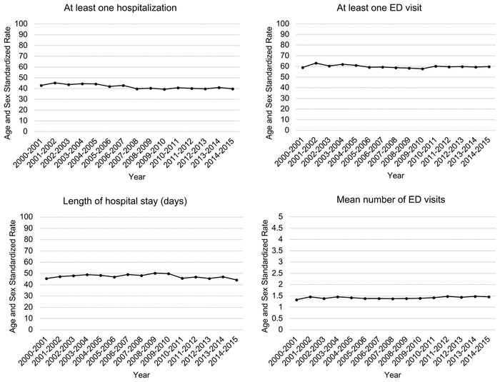 Indicators of hospital use in each study year were summarized as rates, adjusted for differential person-time. Rates were standardized for differences in the distribution of age and sex over time using direct standardization. The age and sex distribution of the 2011 Canada census data was used as the reference population for the standardization.(30)
