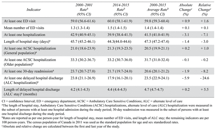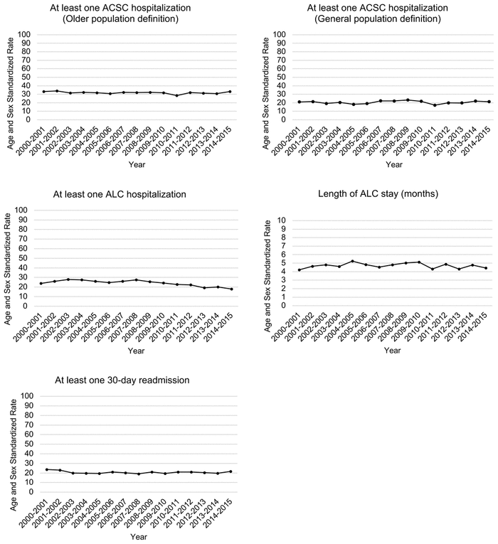 Trends in both types of Ambulatory Care Sensitive Condition (ACSC) hospitalization (general and older population) and 30-day readmission rates remained constant with average rates per 100 person-years: 20.5 (19.9–21.1), 31.7 (31.0–32.4), 20.6 (20.1–21.2), respectively. Rates of delayed hospital discharge (i.e., alternate level of care (ALC) hospitalizations) decreased from 23.8 (21.1–26.9) to 17.9 (16.1–20.1) (relative change −24.6%).
