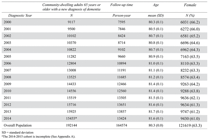 Description of the cohorts of community-dwelling adults 65 years or older with a new diagnosis of dementia in Quebec, Canada, from 2000–2015