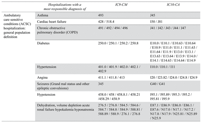 International Classification of Diseases (ICD) codes for the measures of Ambulatory Care Sensitive Conditions (ACSC) hospitalizations (general population definition)