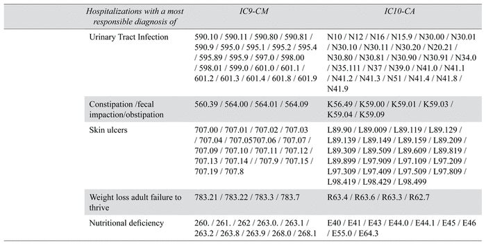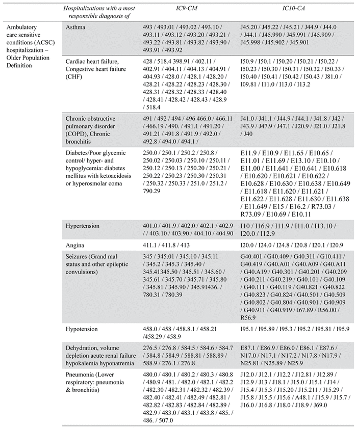 ACSC are conditions, “where appropriate ambulatory care may prevent or reduce the need for admission to hospital”.(13) We measured ACSC hospitalizations two ways. First, with a general population definition as defined by Canadian Institute for Health Information ( CIHI). Second, with an older population definition: the measure developed by Walsh and colleagues on older persons dually eligible for Medicare and Medicaid, previously used in a population with dementia by Feng et a l.(7,14) This definition includes additional conditions that are more specific to an older population such as: hypotension, constipation, skin ulcers, or nutritional deficiency. See details on lists of conditions and ICD codes for each definition below.