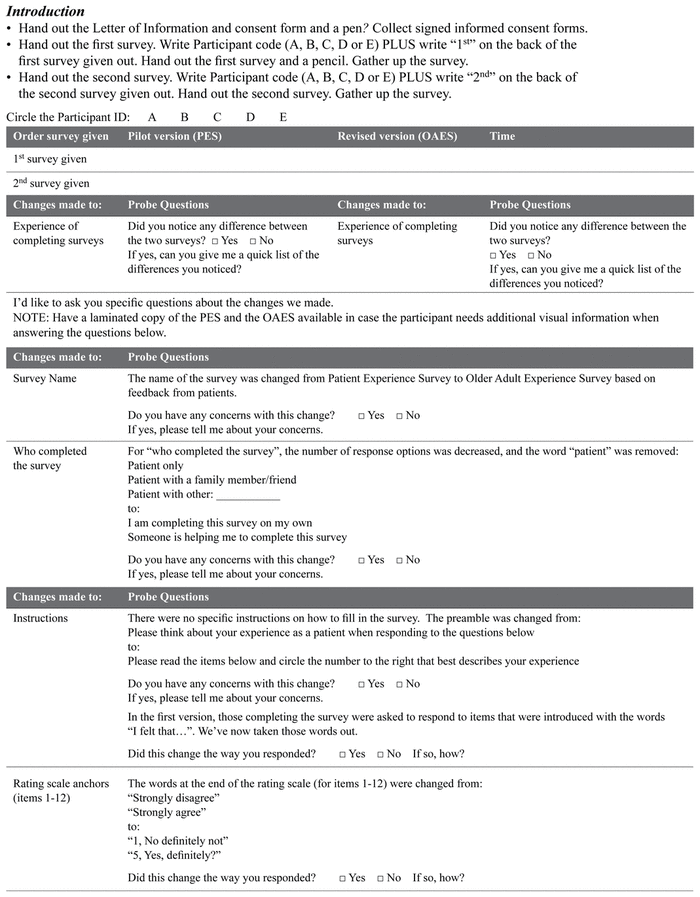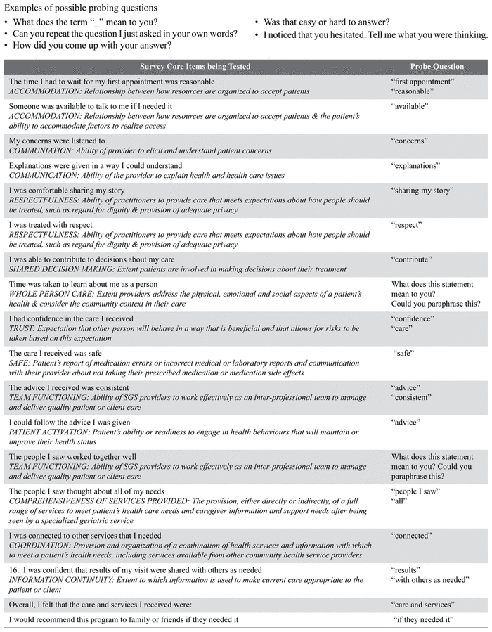 Subsequently, the pilot survey was revised and re-evaluated by a convenience sample of older patients who received SGS services at the Scarborough site. These patients were given both the pilot survey and the revised pilot survey in random order and then participated in cognitive interviews (see Appendix D). Item-by-item frequency distributions were compared using distribution appropriate statistics and qualitative responses were coded.