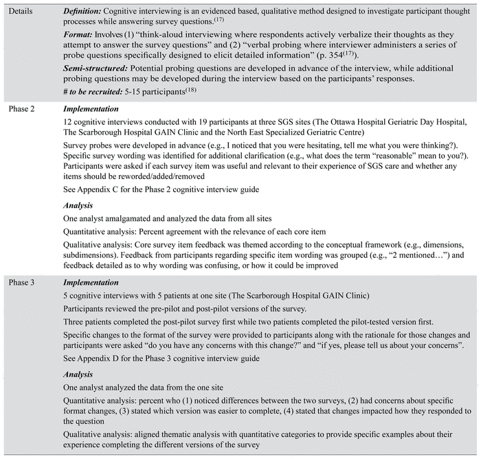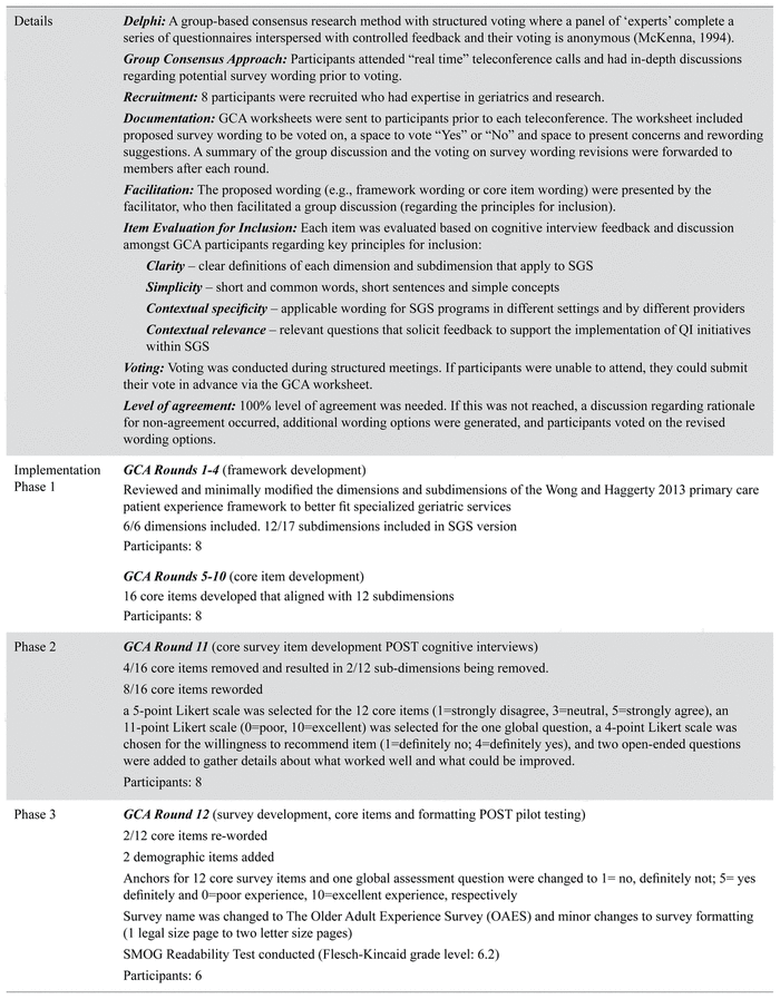 Using established survey research methods, this study was conducted collaboratively with older adults (patients and family members/friends) at three Ontario sites offering SGS. The study was done in three phases: Phase One—literature review, evidence alignment, and operationalization of core survey items; Phase Two—cognitive interviews and refinement; and Phase Three—pilot testing, survey item analysis, and refinement.