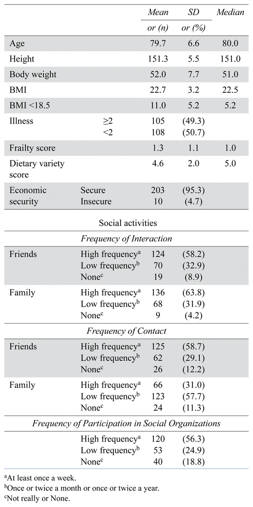 Survey responses were received from 299 participants. Data of 213 participants, excluding those with missing data for age, height, weight, frail score, and social activity (n = 86), were analyzed. Categorical analysis data are shown in Table 1 with the number and percentage of respondents. Continuous variables are depicted as mean and standard deviation. Linear regression analysis was used to examine the relationship between social activity and frailty score. In multivariate linear regression analysis, Model 1 was adjusted only for age (75 years or older), while Model 2 was adjusted for age (75 years or older), body mass index (BMI) (below 18.5), number of illnesses (two or more), dietary variety score, and economic status. Statistical analyses were carried out using IBM SPSS 24.0 (IBM SPSS Statistics, Armonk, NY), with a significance probability set at below 5%.